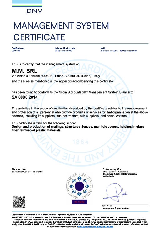 DNV - ISO 45001:2018 Occupational Health and Safety Management System Certificate Design and manufacture of gratings, structures, enclosures, manholes, channel coverings in fiberglass reinforced plastic (IAF 14) Certificate: 10000510958-MSC-ACCREDIA-ITA Initial Certificate date: 26/04/2022 |