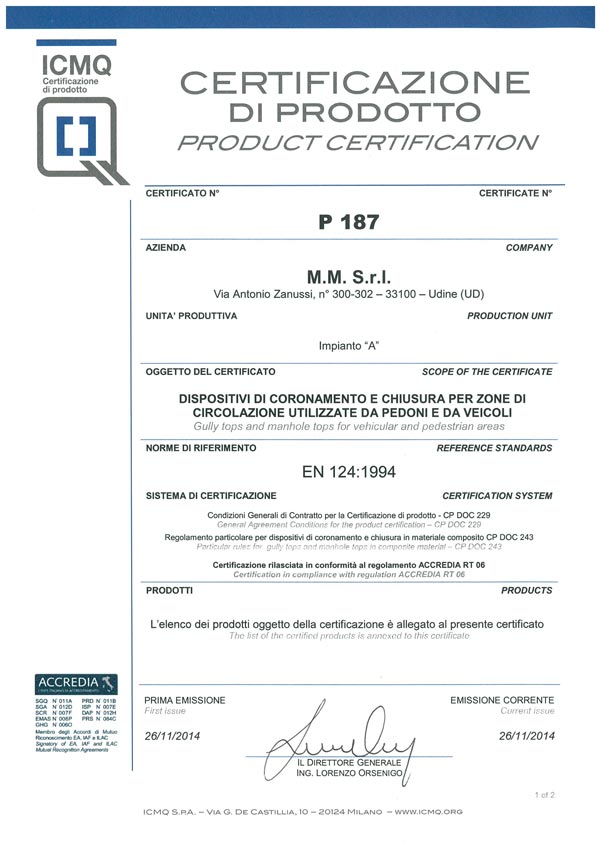 Novedades en casa de M.M. con la nueva certificación de los dispositivos de coronamiento y cerrado para zonas de circulación utilizadas por peatones y vehículos (TAPAS DE REGISTRO) realizados en material compuesto según la norma EN 124:1994 concedida por ICMQ. Como garantía de una calidad ulterior, se han realizado también: ¡ensayo de fluencia, absorción de agua y carburante, resistencia al envejecimiento, dureza, resistencia al impacto y efecto HT, resistencia a fatiga! |