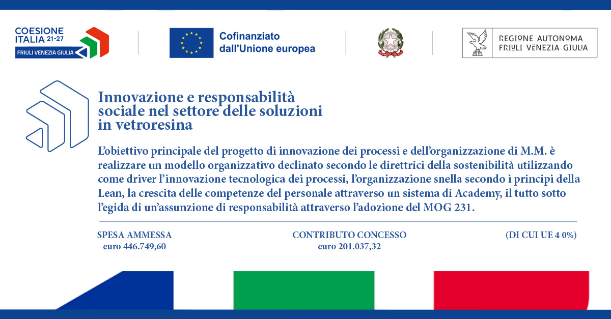 L’obiettivo principale del progetto di innovazione dei processi e dell'organizzazione di M.M. è realizzare un modello organizzativo declinato secondo le direttrici della sostenibilità utilizzando come driver l’innovazione tecnologica dei processi, l’organizzazione snella secondo i principi della Lean, la crescita delle competenze del personale attraverso un sistema di Academy, il tutto sotto l’egida di un’assunzione di responsabilità attraverso l’adozione del MOG 231.